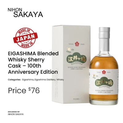 Eigashima Distillery is the only Japanese distillery located by the sea, overlooking the beautiful Seto Inland Sea. As one of the oldest family-run distilleries in Japan, Eigashima holds the distinction of being the first distillery to obtain Japan’s whisky making license in 1919. To honour its long tradition and with eyes towards the future, Eigashima brought back its original signature brand’s logo and aesthetic, launched the Eigashima Blended Whisky Sherry Cask in a limited capacity. This reproduction increased the malt content to more than 50% and alcohol percentage to 50%, which brings out the full fruity aroma of the whisky accentuated by maturing in sherry casks and brings mellow and complex flavors to the nose and the palate.
